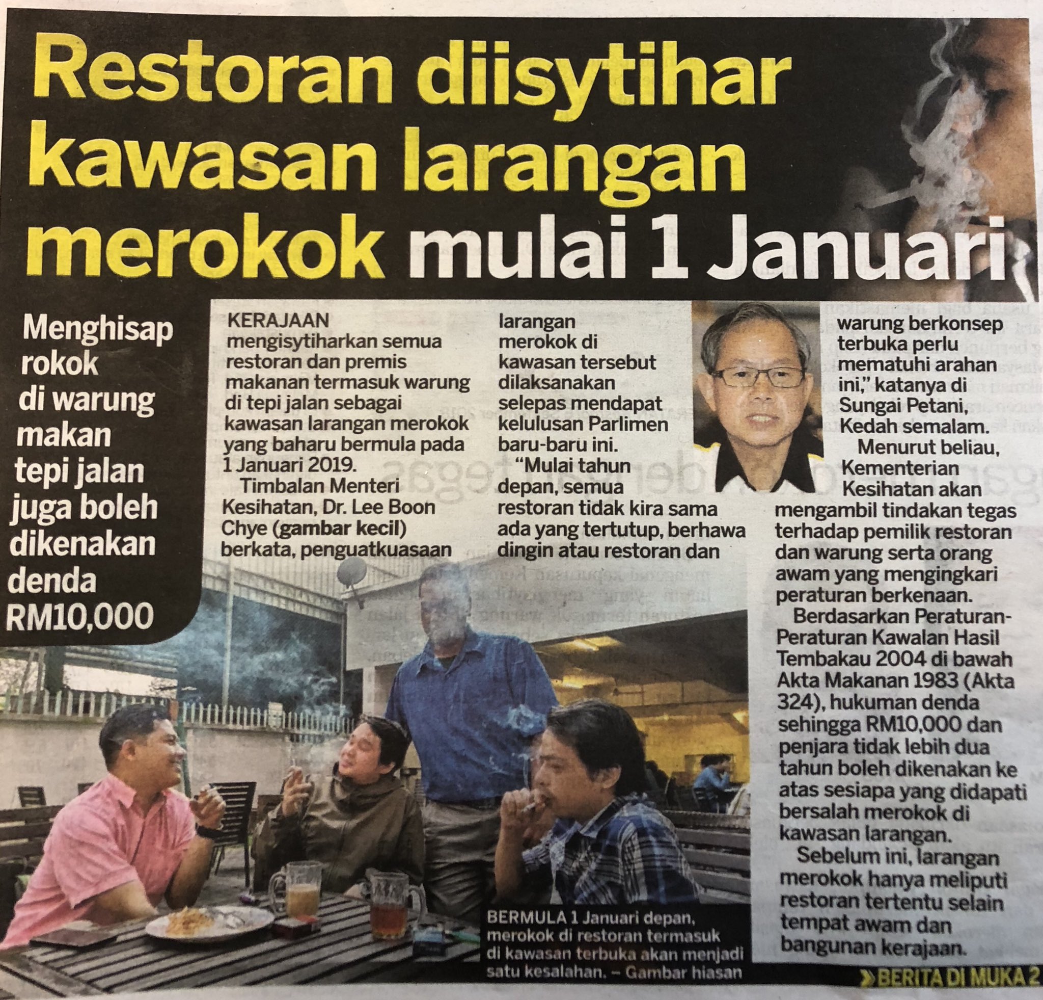 Terkait larangan merokok, jakarta sudah diperkuat peraturan daerah (perda) nomor 2 tahun 2005 tentang pengendalian pencemaran udara jakarta, pergub nomor 88 tahun 2010 tentang kawasan dilarang merokok, dan pergub nomor 50 tahun 2012 tentang pedoman pelaksanaan pembinaan. Pewartaan tempat makan sebagai kawasan larangan merokok di bawah peraturan 11, ppkht 2004 bermula 1 januari 2019 lalu, telah mendapat pelbagai reaksi daripada segenap lapisan masyarakat. Penguatkuasaan larangan merokok di restoran & premis makanan bermula 1 januari 2019. Larangan merokok akan dikuatkuasa oleh pihak kementian kesihatan bermula 1 januari 2019.umi sebagai rakyat , melihat sahaja bagaimana larangan kementerian kesihatan akan mengisytiharkan semua restoran termasuk gerai dan warung di tepi jalan di seluruh negara sebagai kawasan. Larangan merokok di semua tempat makan akan berkuat kuasa mulai 1 januari 2019. Kepada perokok sila ambil perhatian bahawa kerajaan telah mengisytiharkan kawasan larangan merokok. Perokok dibenarkan merokok di kawasan yang disediakan sahaja, tanpa mengganggu orang ramai dengan bau asap rokok. Kesihatan malaysia akan mengeluarkan arahan larangan merokok di semua restoran dan premis makanan di negara ini berkuatkuasa 1 januari 2019 timbalan menteri. Kawasan larangan merokok pun tertuang dalam aturan itu. .kawasan larangan merokok, shisha dan rokok elektronik seperti vape dan nano stick bermula 1 januari 2019 dalam lingkungan jarak 3 meter daripada kedai. Tujuh kawasan ktr diantaranya, tempat umum, tempat kerja, tempat ibadah, tempat bermain atau tempat berkumpul anak, angkutan umum, lingkungan tempat proses belajar mengajar, dan sarana kesehatan. Mulai 1 januari akan berkuatkuasa larangan merokok di semua premis makanan di negara ini, murung lah korang lepas ni bila lepak kat restoran tak boleh nak isap kok lu ! Pewartaan tempat makan sebagai kawasan larangan merokok di bawah peraturan 11, ppkht 2004 yang bermula pada 1 januari 2019 telah mendapat pelbagai reaksi daripada segenap lapisan masyarakat.