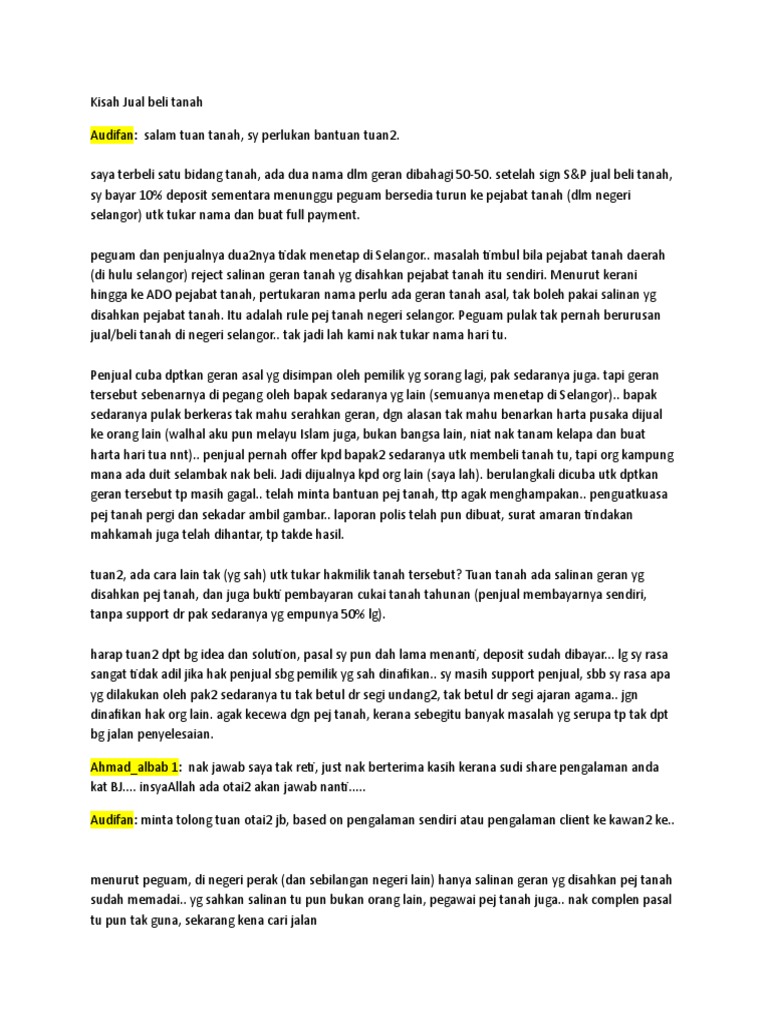 Maksudnya tuan tanah mempunyai pegangan hakmilik ke atas. Jadi, anda boleh menghubungi majlis perbandaran untuk memastikan tanah tersebut termasuk dalam zon perumahan ataupun tidak. Untuk makluman kos ini belum. Rumah ini ada geran atau tidak. Tanah lot geran individu (pecah sempadan). Dan dokumen tambahan seperti berikut jika pelanggan. Ia telah diganti dengan geran mukim. Tanah ni geran individu ke geran bersama? Jadi, membaca document title (geran) terkini adalah sangat2 penting di dlm urusniaga tanah. Hak milik tidak dijamin kerana geran tidak ada. Dan seandainya tanah tersebut digadaikan kepada bank, geran asal tanah tersebut akan dipegang oleh pihak bank. Tapi biasalah, mesti anda akan kata ianya akan melibatkan kos yang tinggi dan kebanyakan orang tak mampu kan? Misalnya dari pertanian kepada bangunan.